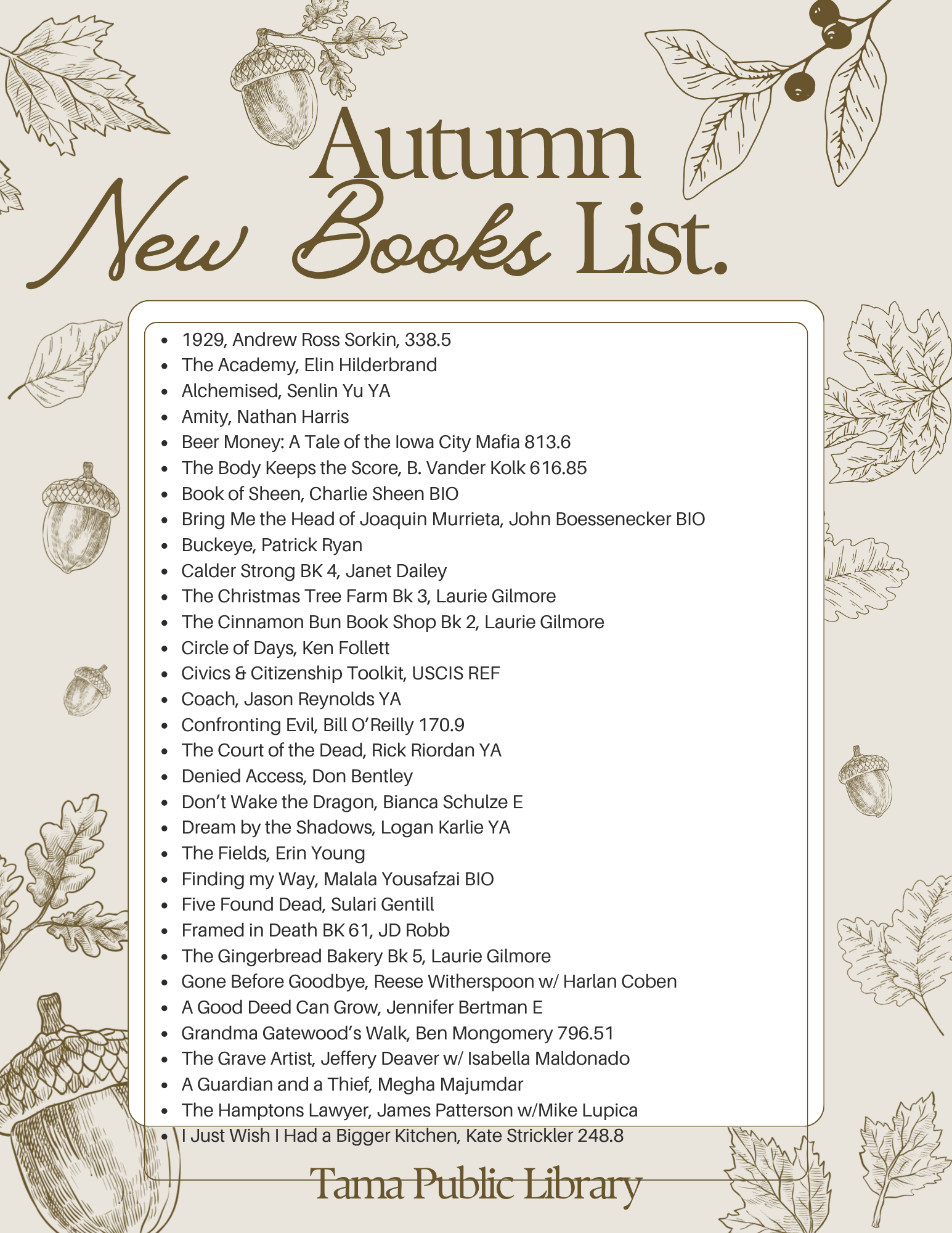 Welcome to the Tama Public Library. The library is your one stop source for all of your informational needs. We have a large selection of books, magazines, newspapers, and electronic resources available to be checked out by our library card holders. Here you will also find electronic resources, news, announcements, and a calendar of upcoming library events!